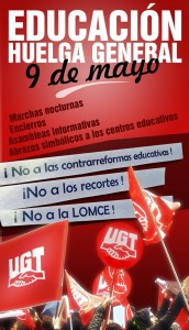 Este jueves, 9 de Mayo, la comunidad educativa (Sindicatos, entre los que se encuentra UGT, Asociaciones de Padres y Madres, Organizaciones Juveniles) ha convocado una jornada de huelga en el sector de la enseñanza pública y privada, en todas las etapas educativas, para decir No a las políticas del PP que están desmantelando la sociedad del bienestar y están ahogando y mermando la gestión pública. En Castilla y León, están convocadas manifestaciones en todas las provincias.