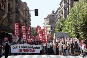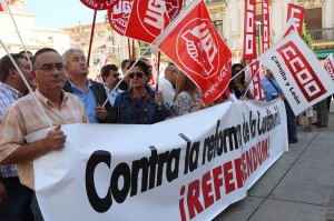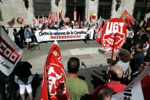 Los sindicatos UGT y CCOO y las organizaciones sociales de León se concentran para pedir la convocatoria de un referendum sobre la reforma de la Constitución