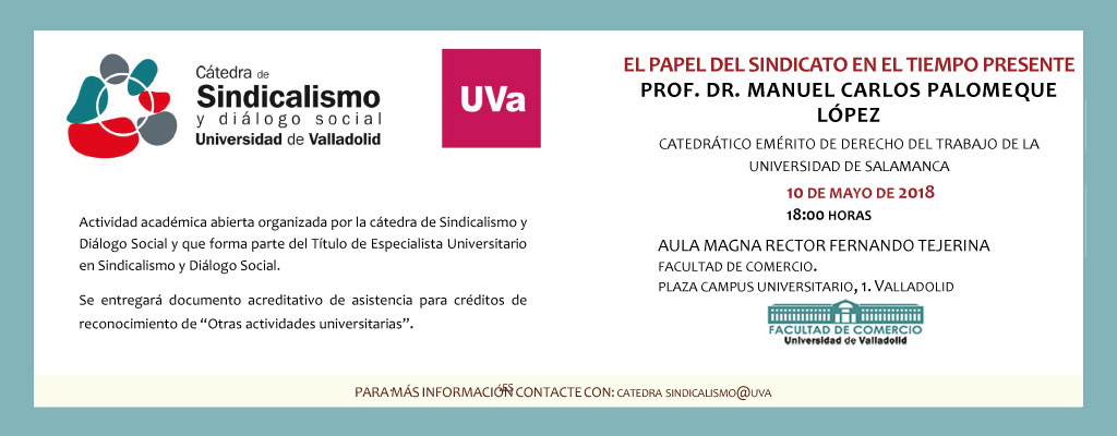 La Conferencia, que se celebrará este jueves en la Facultad de Comercio de la UVA, forma parte del ciclo de actividades académicas abiertas organizadas por la Cátedra de Sindicalismo y Diálogo Social de la Universidad Pública Vallisoletana. MANUEL CARLOS PALOMEQUE LÓPEZ impartirá el Jueves 10 de...
