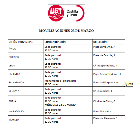 Por salarios dignos, por empleo estable y por la recuperación de los derechos eliminados por las reformas de los Gobiernos y por la avaricia empresarial, hacemos un llamamiento a las trabajadoras y trabajadores a impulsar las movilizaciones participando en los actos convocados el 23 de marzo.