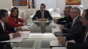 El Presidente del Gobierno y la Ministra de Empleo y Seguridad Social se han reunido esta mañana en el Palacio de la Moncloa con los secretarios generales de CCOO, Ignacio Fernández Toxo, y UGT, Cándido Méndez, y los presidentes de la CEOE, Juan Rosell, y CEPYME, Jesús Terciado. Tras analizar la situación económica y social por la que atraviesa el país y desde la responsabilidad, han buscado puntos de encuentro que contribuyan a la confianza y favorezcan el crecimiento y la creación de empleo. En particular, han acordado dinamizar el diálogo social en materia de protección social, empleo y seguridad social.