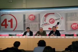 El Secretario General de UGT, Cándido Méndez, el Secretario de Organización y Comunicación, José Javier Cubillo y el Secretario de Acción Sindical, Toni Ferrer, han presentado esta mañana en rueda de prensa el 41º Congreso Confederal de UGT que se celebrará en Madrid del 10 al 13 de abril bajo el lema “La unión por el trabajo. Acción y Solidaridad”.