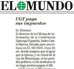 El director de la Oficina de Información de la Conferencia Episcopal Española, Isidro Catela Marcos, firma hoy un artículo en El Mundo, “Deus ibi est” (Dios está allí) en el que asegura que al igual que la Iglesia, y en virtud de la Ley de Mecenazgo, ni los partidos políticos, ni los sindicatos,… ni un largo etcétera, no pagan el IBI.UGT SÍ paga el IBI y las tasas municipales en todos los edificios de su propiedad, de acuerdo con la normativa vigente. Lo paga ‘religiosamente’ y, por eso, no entendemos porque responsable de “Información” de la Conferencia Episcopal Española menciona a UGT para justificar algo que, al parecer, la Iglesia no hace.